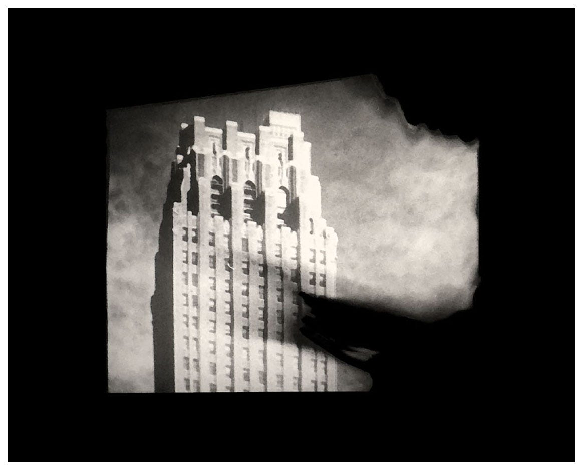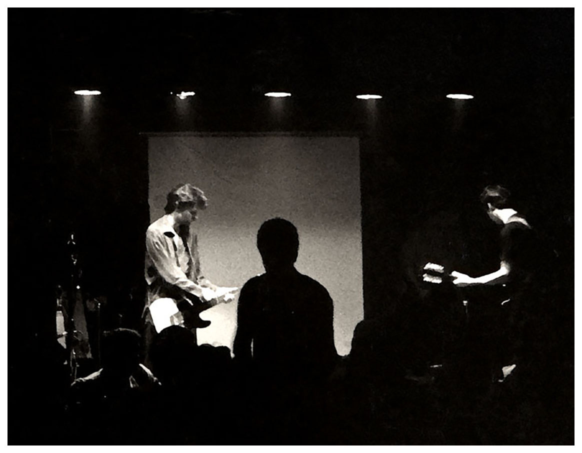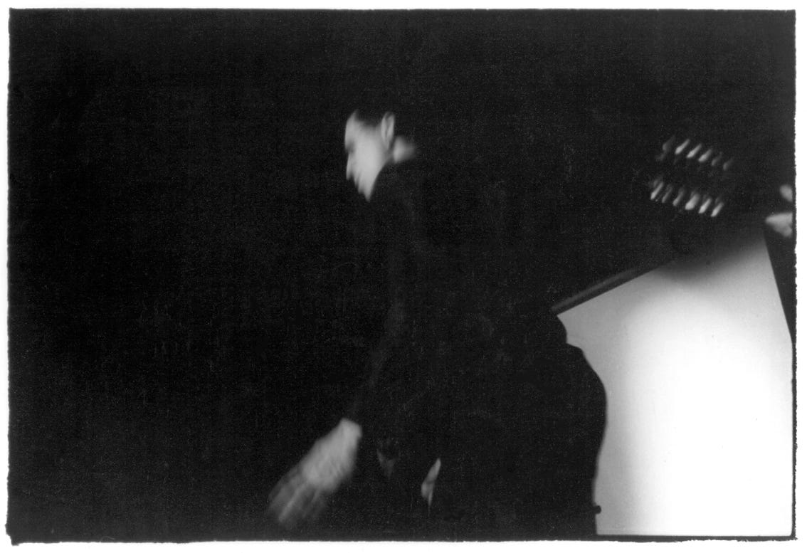 This second time, though, a series of grainy black-and-white slides of ambiguous, film-noir-ish scenes were projected on a screen behind the band. A famous shot of the old Pennsylvania Station with the huge beams of sunlight beaming down, a Pacific Island beach with low flying (Japanese?) fighter planes. The brilliant whites in all the images had a transcendental vibe that seemed to connect them to each other. One at a time an image would appear, long slow fade in then hold a long time then long slow fade out. There were only about 5 slides over the half-hour, moving in glacial time. Turns out these were the work of fellow musician and up and coming ‘art star’ Robert Longo, and their use during the second ‘half’ of the performance became an integral part of the piece.