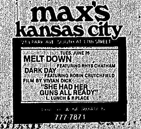 On a Tuesday evening in June of 1979, drummer David Linton and I were riffling through the listings in the back pages of The Village Voice looking for something to do. We had just moved to New York City intent on unleashing our band The Fluks (later: The Flucts) on the town. The Voice, along with the Soho Weekly News and smaller publications like the East Village Eye and New York Rocker, had chronicled the uprising of the punk era, and the following caught our eye: Meltdown at Max’s Kansas City. ‘Steve Reich meets The Ramones,’ said the Voice Choice. It had been only months since one of the worst nuclear reactor accidents on record had occurred at Three Mile Island near Harrisburg, Pennsylvania. It was big, scary news. “Meltdown featuring Rhys Chatham”. High noon in the nuclear era, and some band had called itself Meltdown!