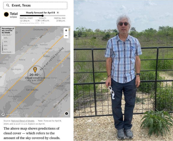 We chased the blue skies out of overcast Austin for an hour and a half. We had to outrun the clouds, and used weather maps as our driving guide. Once we were 1 hour outside of Austin, we started to see pockets of people set up to watch, on hillsides and in parking lots, in front of diners and road stands. Lawn chairs, telescopes, paper eclipse glasses at the ready. Very festive feeling, exciting. But it was still overcast above, and we kept following the maps onward.