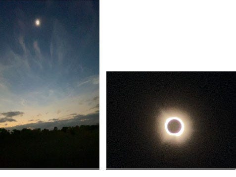 At last the sky was a perfect blue - no clouds! Perfect skies all thru totality - which was almost an out of body experience. When the light changed – it got dimmer and dimmer – it was magical. The shift in light across the landscape all thru totality was astounding, We didn’t really detect the light dimming until the moon was maybe 80 or 85 percent of the way across the sun – so, only near the very end, even after such a large portion of the sun was already covered, did it start to dim. Shows just how bright the sun is. But then suddenly it was eerie twilight and the goats were bleating and the birds cawing. We could then pull the eclipse glasses off and stare directly at the corona, blazing in the darkened sky. It looked unreal, like science fiction. We had The landscape turned pale red sunset all around, 360 degrees of sunset, an eclipse phenomena I’d read about. As the darkness took hold, crickets started up a chorus – they thought night had descended, and kept it up for quite awhile after the light came back. We saw the beads just before totality, and the diamond ring briefly just before the sun flamed back on and it was ending. As the moon drifted off the face of the sun some cloud cover finally rolled in, but we were able to watch all the way thru the moon’s exit, just the three of us, out in nature, with no one around. Couldn’t have been more perfect. What a time! Very moving.