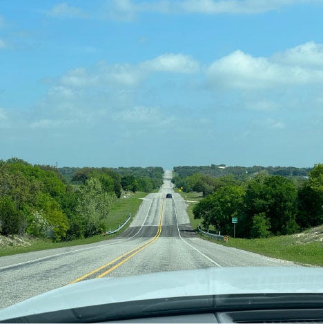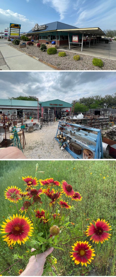 Stopped to pick wildflowers on a gravel road. Plenty of steers, goats, cows, horses, and also emu, llamas, and armadillos (most roadkill). Further along, Texas roadside junk-shop-of-our-dreams. Rusty old tools and giant saws, wirework sculptures, cow skulls and so much other rural bric-a-brac, Texas-style. Also serving pulled pork sandwiches which left Sage in heaven. Run by a woman from Australia, of all places, out here in the hills of Texas. We had a nice conversation with her – and with so many people today. So odd that there was an earthquake in NYC while we were out there in Texas - I never knew there were earthquakes on the East Coast…