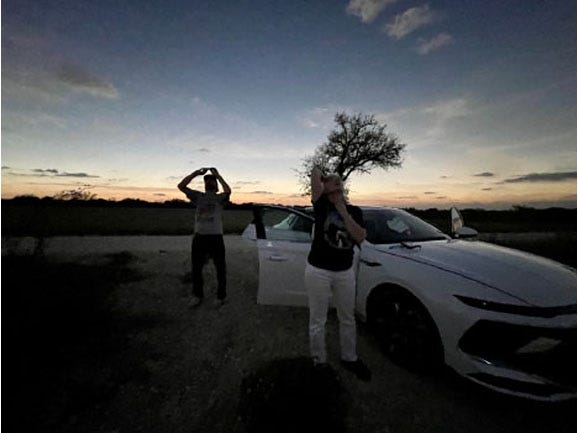 With maybe 30 minutes to go before the sky phenomena was to start, we pulled into the little town of Evant, TX (pop 426). A perfect one-stoplight town. There were a few dozen people sitting around outside between the diner and the parking lot, glasses at the ready. The place was buzzing. But we wanted to be by ourselves and out in nature for the experience, in order to feel the light change and hear and see wildlife reactions, so we traced a small county road out of town (following the maps!) then down a local gravel road and pulled off in front of a beautiful piece of property for sale. Through an iron fence, Texas scrub trees and rolling hill country. Across the road, an immense field of purple flowers with goats grazing in the distance under far trees, trying to stay out of the sun.